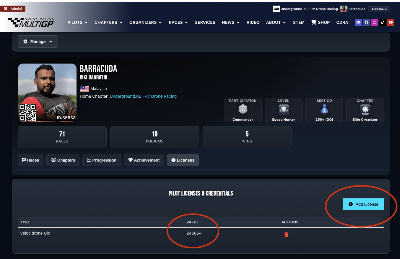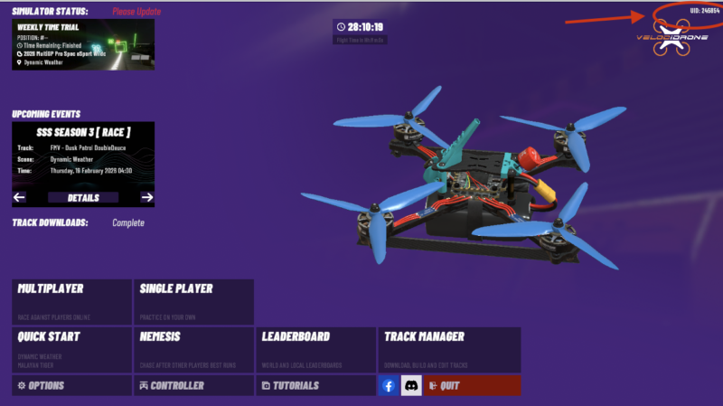 It’s possible to run a race on Velocidrone and manage it via Rotorhazard using RH VELOCIDRONE plugin on Github. It become even better if you can manage the pilots via RH MultiGP Toolkit plugin. In order for pilots form MultiGP to flow down to RotorHazard and subsequently track laptimes on Velocidrone, each pilot must configure their Velocidrone UUID with MultiGP. To do so look for the UUID on the top right corner of the Velocidrone launch screen. Grab it and head over to the MultiGP pilot profile page and hit the license tab. Update the license here and thats it. Happy flying.